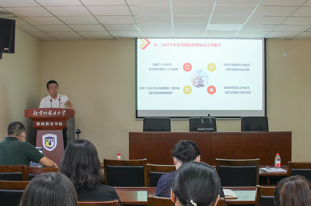 高晓东传达了北外2022年全面从严治党工作会议暨警示教育大会精神,传达了学校秋季学期工作部署会王定华书记5个方面工作要求和杨丹校长专题报告内容。