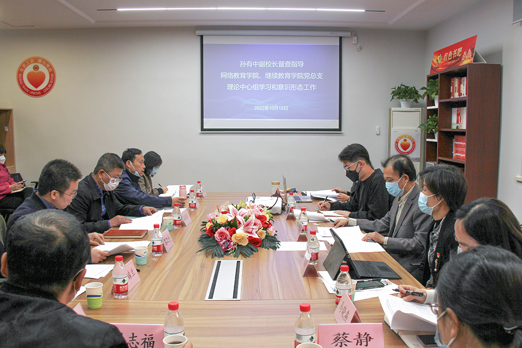 10月10日下午,党委常委、副校长孙有中带队调研指导网络教育学院、继续教育学院党总支理论学习和意识形态工作,党委宣传部副部长王薇薇、干部邱显锋陪同调研。党总支书记陈洪兵,党总支副书记、继续教育学院院长高晓东,党总支副书记、网络教育学院院长唐锦兰,人工智能与人类语言重点实验室主任李佐文,继续教育学院副院长马晓燕、刘志福,科技园公司副总经理乔婧,网络教育学院副院长蔡静,继续教育学院党支部书记曹彦琳等理论中心组成员等参加调研活动。