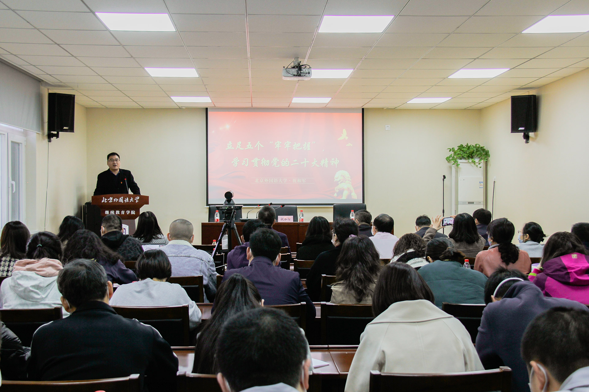 党总支副书记、继续教育学院院长高晓东梳理了习近平总书记提出的“五个牢牢把握”、“六个必须坚持”以及党的二十大报告中关于教育、科技、人才的重要论述,强调党的二十大报告站高谋远、博大精深、指向精准,一定要深刻领会把握其丰富内涵和精神实质,切实做到学用结合、知行合一。