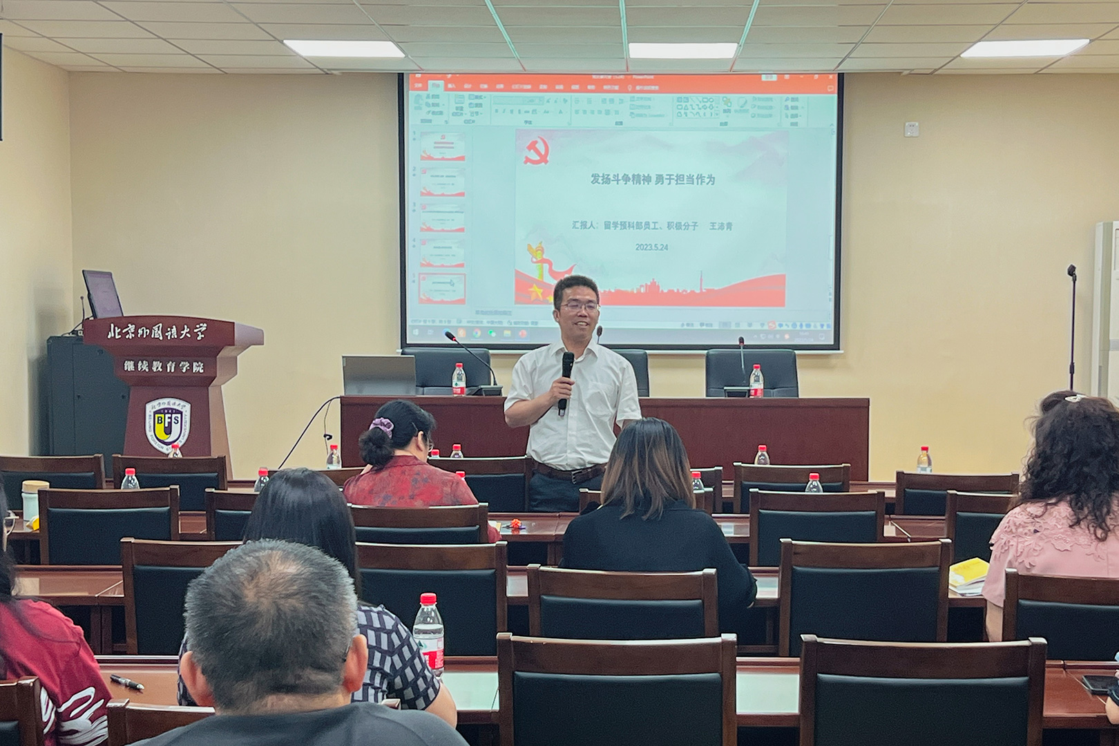 党总支书记陈洪兵强调主题教育要坚持学思用贯通、知信行统一,做到以学铸魂、以学增智、以学正风、以学促干。深入思考“中国式现代化,继续教育何为”,结合外语继续教育和学院发展特点,在培养现代化建设当班人、全球胜任力人才、全球领导力人才方面下功夫。