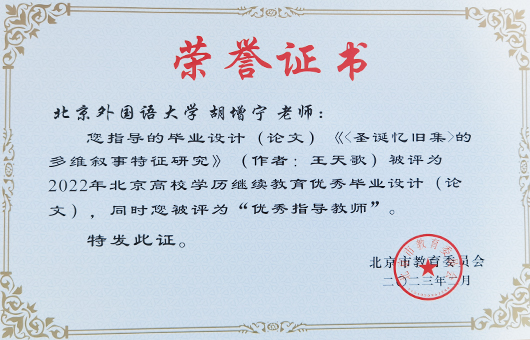 近日,在北京市教委组织的北京高校继续教育大学生优秀毕业设计(论文)遴选工作结果揭晓,我院学历教育部学生王天歌的毕业设计(论文)《<圣诞忆旧集>的多维叙事特征研究》获评2022年开展北京高校继续教育大学生优秀毕业设计(论文),指导教师胡增宁获评优秀指导教师。