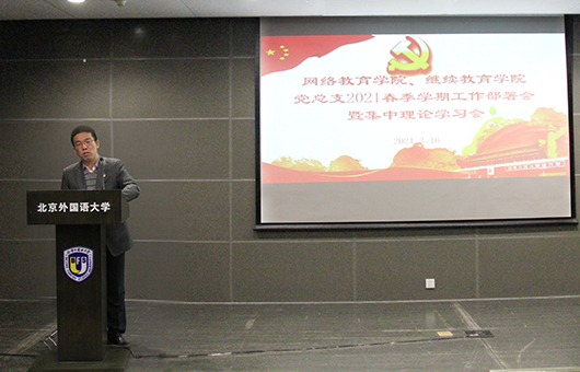 党总支书记陈洪兵传达了学校新学期工作部署会王定华书记和杨丹校长的讲话精神,布置了本学期党总支的主要工作:学习贯彻学校党代会精神,明方向、强动力、促发展;编制好“十四五”规划,推动规划落地、落实;开展党史学习教育,学党史、悟思想、办实事、开新局;做好党委巡查整改落实,提高政治建设水平;加强班子和队伍建设,提升思政工作质量,推进示范带动、支部牵动、党员行动和党群互动;开展迎接建党100周年和建校80周年系列活动;统筹做好常态化疫情防控和教育教学工作。