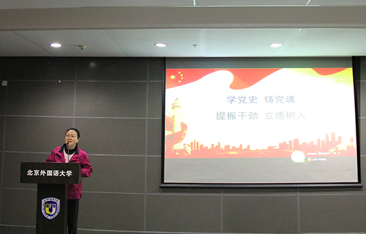 网络教育学院副院长蔡静以“学党史 铸党魂 提振干劲 立德树人”为题讲党课,她解读了习近平总书记在党史学习教育动员大会、全国脱贫攻坚总结表彰大会上的重要讲话和在全国两会上关于教育的重要论述,并与大家分享了自己的感悟与体会。