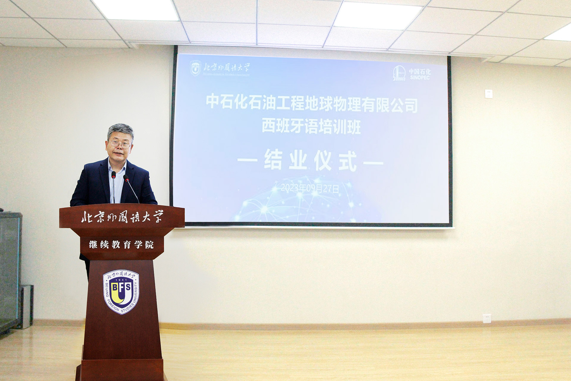 9月27日上午,“中石化石油工程地球物理有限公司西班牙语培训班”结业式在西校区壹教学楼207会议室举行。中石化石油工程地球物理有限公司国际业务发展中心总经理、党委副书记王国来,副总政工师、综合管理部主任王永平,党群管理王勋,我院院长高晓东出席活动。结业式由我院副院长马晓燕主持。