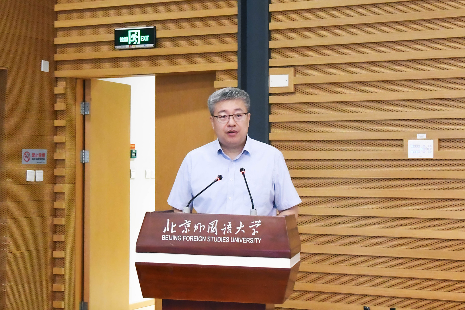 贾德忠向全体学员表示热情欢迎,向商务部人事司对北外工作的信任支持表示衷心感谢。他概述了北外的历史传统、语种建设、学科特色和服务社会的育人成果,介绍了本期培训的师资团队和课程安排。他将对外事翻译工作重要性与关键点的深刻解读与各位学员分享共勉,鼓励大家打好语言基础,培养跨文化敏感度和跨文化适应性,拓展专业领域的国际维度,为助力我国贸易强国建设再立新功、再创辉煌。