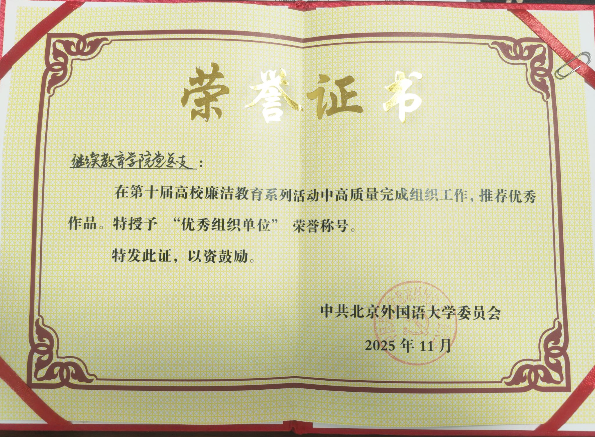 近日,2025年北京高校廉洁文化建设成果征集结果公告正式发布,继续教育学院2件作品成功入选。同时,在北外“第十届高校廉洁教育系列活动及廉洁文化作品征集活动”中,学院选送的4件作品也斩获佳绩,学院获得“优秀组织单位”荣誉称号。