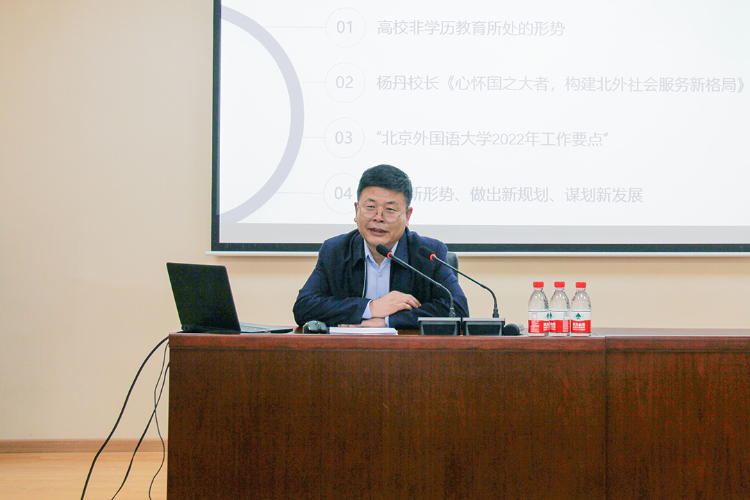党总支新学期工作部署会后,高晓东以“认清形势、振奋精神、接续努力,重整旗鼓再出发”为题,详细解读了杨丹校长《心怀国之大者,构建北外社会服务新格局》专题报告的重要精神,剖析了高校非学历教育所处的形势;结合“北京外国语大学2022年工作要点”与学院实际,对本学期重点工作进行了安排部署:严格遵守新管理规定;调整学院定位;有所为而有所不为;争创“全球领导力”品牌;核定编制、管理预算、调整职级。他勉励全体教职工积极谋划、主动作为、狠抓落实,高质量完成全年各项任务,在实干中开新局、谱新篇。